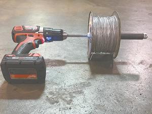 To unroll wire he ties one end of the wire to a post, then grabs the handle and starts walking. To roll up wire, he attaches a 1/2-in. cordless drill to the other end of the rod.