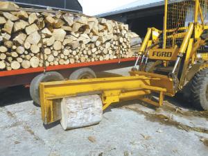 “The push bar rides on two channels with about 3 in. of space between them, so I can pick up chunks of wood from 4 in. to about 20 in. in diameter,” Borgelt says. “If a piece is too large to lift by hand, I can lift it onto a wagon and split it so it drops right onto the pile.”