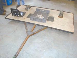 His first attempt at a planter was a plywood sheet about 3 by 9-ft. over an angle iron and steel tubing frame. Wheels were mounted inside the frame, which had a long, fixed tongue. Rectangular holes cut in the plywood allowed Forsburg and another worker good access to the open furrow.