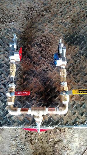 He bought several brass fittings, a pair of ball valves, and an air coupler, hooking them all together to make a U-shaped splitter that hooks up to the compressor. Hoses hook up to the splitter and run to a pair of couplers that he attached to the “gladhand” interlocking hose coupler that was already on front of the trailer. The hoses supply pressurized air from the compressor to the brakes on the trailer.