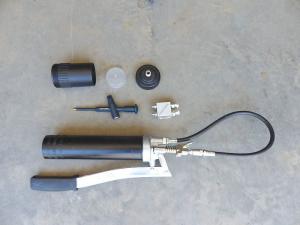 The new grease gun uses vacuum to move grease forward with a follower cap that moves up the cartridge. To use, you remove the pop-top from the grease cartridge, then remove the cap from the other end of the cartridge, and push a plastic follower cap into the tube and against the grease. You then thread the barrel into the pump head, and pump the lever to create the needed vacuum. Continued pumping pulls the grease and the follower cap up the tube.