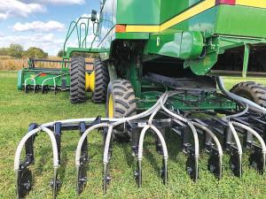 The goal is a cost effective method of planting cover crops. His concept is an alternative to broadcasting from a combine, or making a separate pass with a tractor and drill requiring time and fuel.