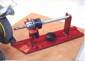 Roy Albertson keeps his drill bits sharp with an adjustable jig. A chuck threaded to a 1/2-in. bolt with a lock nut rides on the jig and holds the bit against the flat side of a grinding stone. Sliding components allow for minute adjustment, as well as simply flipping the bit over to sharpen the opposing side.
