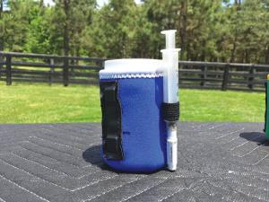 Sometimes a partially filled, refrigerated animal medication has to be thrown out due to warming while in use. The Pharm Huggy is like a can koozie, but for medication bottles. A freezer cold pack in the base keeps medications cool up to 8 hrs., while a cap keeps the bottle secure, yet accessible for a syringe. Four adapter inserts match common bottle sizes. Sized to fit standard cup holders to keep medicine secure in vehicles or tractors, Pharm Huggy has a built-in magnet for quickly attaching to metal surfaces.