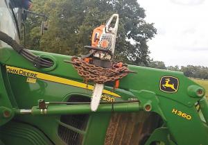 Chains N Things slips over the arm of a loader to carry log chains and a chainsaw safely on a loader tractor. Four rare earth magnets and ratchet straps hold it in place. Chains wrap on 2 prongs, while 2 clevis fasteners can be pinned to the steel plate. A steel sleeve holds a chainsaw in place as well.