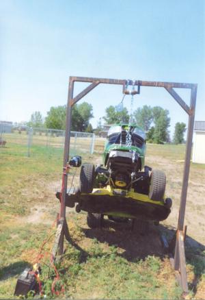 “A local welding shop built the frame for me using 2-in. sq. tubing. An ATV winch bolts to the side of the frame about 3 ft. up on the side. I ran the winch cable up through a pulley at the top. Once the mower is up, I attach a safety chain to it to hold the mower securely in place.