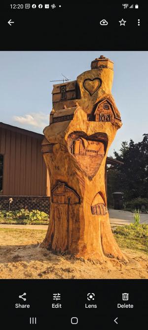 For Corey Arnett and her husband, the sculpture has a dual purpose. It saves part of a 150-year-old tree they treasured, and it pays tribute to American barns.