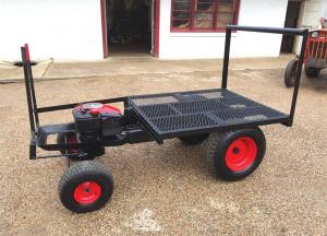 He Makes Custom Motorized Garden Carts MISCELLANEOUS EQUIPMENT Miscellaneous Clint Evans builds motorized garden carts designed to meet customer needs whether hauling construction tools garden goods or horse manure The one constant is the basic design Aside from the paint and a few bolts they are built from repurposed materials starting with stripped-down Murray lawn tractors “The old Murray rider has one of the best hydrostatic transmissions I’ve seen ” says Evans “It’s super durable really basic with a single drive belt and the Murray has a good chassis ” The chassis four wheels and the transmission are about all that’s left of the Murray when Evans is done Power is provided by a push mower engine that he mounts above the old front end with the rope pull facing the operator “The lawn tractors have a bigger engine than the cart needs ” says Evans “The engine battery and gas tank all take up space A 5 to 7-hp engine from a push mower is big enough is compact and uses very little fuel ” Evans built the first cart for his own use around his small engine shop It satisfied his needs and soon attracted interest from customers who saw it It was narrow and versatile and the operator didn’t have to climb down from a seat to load or unload “I wanted to be able to walk alongside and control it ” says Evans “I always liked old-style tractors with hand clutches so I used similar levers to control the cart It’s like driving a forklift with the load ahead of you ” One lever is tied into the steering for tiller steering A second is connected to the hydrostatic transmission to control forward reverse and speed “With the hydrostatic you can move as slow as you want or as fast as a jog ” says Evans “One customer needed to carry hand tools across a university campus I added a seat over the engine and geared it up so you would have to run to keep up He was able to drive it into the building and right into the classroom ” Once the engine and controls are in place the rest of the design is up to the customer Evans modified the chassis frame to carry a bed one that tilts if desired Here too simplicity reigns The steering lever serves double duty Pull a pin and it becomes a lever for tilting the bed Slide it into a pipe on the side of the bed and lift The base price for a cart starts at around $700 and can run to $1 000 depending on extras “I had one guy who wanted a bed that could hold three to four wheelbarrows full of material ” recalls Evans “I set it up so he could open the end gate letting material run out a chute When enough was gone he could lift it up to dump the rest ” “Most of my customers like the narrow profile ” he says “A landscaper needed to carry root ball trees through 40-in garden fence gates to plant in backyards I added a brace at the back of the bed to help support the tree and used expanded metal for the bed ” Another customer needed to carry tools including an air compressor nail guns and saws into a multi-story building It took five employees an hour in the morning and one in the evening just hauling tools “I built a special rack for the tools and he was able to drive it off his truck and into a freight elevator with all the tools ” says Evans “At night he drove it out and back to the truck He got his return on the cost in just five days ” Contact: FARM SHOW Followup Clint Evans 114 State School Rd Gatesville Texas 76528 ph 505-592-2734; cnbevans@centurylink net