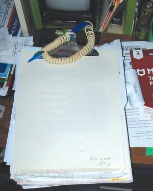 Parks didn’t want to throw away an old broken coiled phone cord, so he disconnected it from the phone and, using electrical tape, attached one end to a ballpoint pen and the other to a clipboard clip hole, securing it in place with a plastic bag twist tie. Now when he grabs his clipboard, a pen is always included.