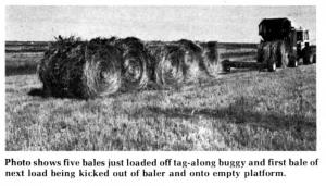 The Tag-Along Buggy hitches right behind the baler to load each bale as it's kicked out by the baler. It holds five 6-ft. dia. bales (or six 5-ft. dia. bales). Bales are dropped off five at a time as the field is being baled.