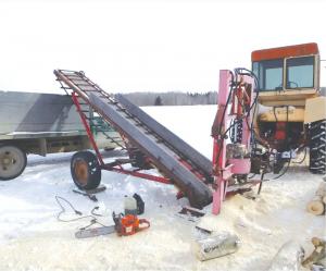 Splitter/Stacker Runs On Tractor Hydraulics TRACTORS Hydraulics Marvin Torwalt says that when he started a wood business 20 years ago with an axe and a wedge he soon realized there had to be a better way “Didn’t have any trouble staying warm or staying in shape but it sure was tough on the body after a while ” he says He looked at commercial splitters which didn’t do exactly what he wanted so he built his own splitter/stacker It’s been a workhorse ever since Torwalt says he wanted a splitter that would handle large chunks without having to turn the block two or three times A business he’d worked for used a converted hydraulic press which had a few shortcomings with the hydraulics so he improved on that design for his own rig Torwalt built an 8-ft vertical frame out of 4-in heavy wall tubing About 30 in up from the base he welded a channel iron cross brace to mount a stationary cutting platform He mounted the base of the hydraulic cylinder to the top of the frame and used a horizontal support brace 24 in down to hold it securely in place The ram has a head with wedges to split a block into several pieces when the cylinder is extended “I wanted to run my splitter with my tractor loader so I geared the onboard hydraulic pump so the tractor could run at a fast idle ” Torwalt says “That gave me the hydraulic pressure I needed I could split a full cord of wood using about 5 gal of fuel ” Torwalt says the splitter worked great the first time he ran it but the split pieces piled up quickly and he had to move them away and start again “Does that sound familiar?” he asks “I knew there had to be a better way ” He figured that out using various parts picked from his scrap metal pile He assembled those into a conveyor that he mounted on a two-wheeled chassis made from a harrow drawbar The base of the conveyor sits under the splitter and the top discharges wood into his box truck or on a large pile Split wood moves up the conveyor on a slatted feederhouse chain from an old White/Cockshutt combine The chain is driven by a variable-speed motor powered by his tractor hydraulics Torwalt says his homemade splitter/conveyor system has served him well for several years with just a few enhancements to make it more efficient “It sure beats an axe and a single wedge ” he says Contact: FARM SHOW Followup Marvin Torwalt White Fox Sask Canada
