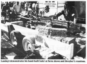 Art Landuyt, Williamsburg, Iowa, demonstrates the hand-built baler at farm shows and thresher's reunions. A 1/4 scale model produces 1 1/2-lb. bales of straw measuring 12 in. long, 4 in. wide, and 6 in. high, or 5-in. long bales that are 1 3/4 in. wide and 2 in. high. He sells the bales for $2 apiece.