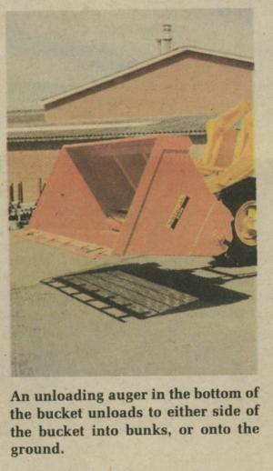 His company's new feed bucket mounts on either the tractor 3-pt. or can be mounted on the tractor loader. It pivots flat to the ground for loading, much like a conventional loader bucket, then pivots upright to carry its load. An unloading auger in the bottom of the bucket unloads feed to either side of the bucket into bunks or onto the ground.