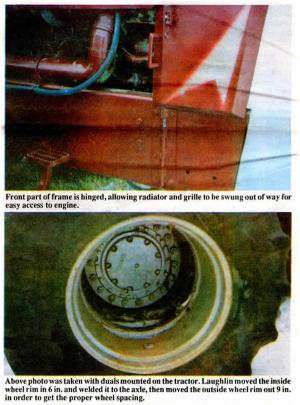 "It really works great and has a lot of power. I used it last year to pull my 56-ft. air seeder and 72-ft. field cultivator," says Laughlin, who built the tractor with help from sons Jeff and Tim and friend Billy Powell. "I built it because the Cummins V-8 diesel engine on the Massey tractor was worn out and I wanted more power. The Clarke planetary rear axles are the type used on big earth-moving and logging trucks, so they're built very heavy. It doesn't look like a rebuilt tractor. I took it to a farm show last year, and a lot of people thought it was factory-built.