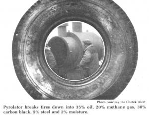 "There are millions of used tires piled up in dumps across the country that are nearly impossible to dispose of. Even if you bury them, they tend to rise to the surface if they haven't been chipped up," says Harold Fredrickson of Kutrieb. "Our machine breaks tires down into basic elements that can be used to remanufacture other products. We've found that a typical bias ply tire contains 35% oil, 20% methane gas, 38% carbon black, 5% steel and about 2% moisture."