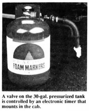 The pressurized foam canister is mounted on the sprayer hitch and a timer box is mounted in the tractor cab. You use the timer to control the length of the marks and the distance between drops. The timer opens and closes a solenoid, causing drop tubes mounted on each end of the boom to dispense foam. A manual overide switch on the timer allows you to drop foam more frequently while turning at the end of the field.