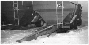 Bunne first bought new J&M grain boxes from a local dealer, and then fitted them to heavy-duty truck frames he picked up inexpensively. Since the wagon boxes were 10 ft. wide and the truck axles only 8 ft., he had to widen out the axles using pieces of I-beam. "The extra 2 ft. adds lots more stability on the road," Bunne notes.