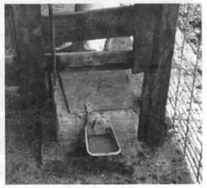 "This waterer consists of a square concrete box with 6 in. thick walls. Outer diameter is 15 by 22 by 10 in. high. The inside compartment is 9 by 16 by 10 in. high. The water line comes up through the center and out through the sides of the concrete wall to the water cup. There's a water shut-off inside the waterer. A 100-watt lightbulb inside the compartment provides enough heat to keep the water line from freezing. When the concrete was poured, a piece of 1/2-in. galvanized pipe was placed in it to carry an electrical line to the bulb. The pipe runs straight up out the top of the waterer.