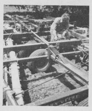 On each wing Wiemers uses the combination of a 48 in. by 4 in. hydraulic cylinder and a large coil spring that will handle 1,200 lbs. of pressure. He estimates that actual pressure exerted on each wing and spring for field operation is right at 400 lbs. He put about $600 into the two cylinders, coil springs and mounting brackets.