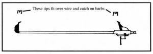 "I used an old auto bumper jack and welded a piece of 1 1/2-in. wide, 1/4-in. thick strap iron onto the end of the shaft and onto the lift lever on the jack. I put a 3/16-in. slot into the end of each piece which catches onto barbed wire barbs. I put a bolt in the end of the shaft to keep the jack from slipping off. You can weld on a handle or use the tire wrench as usual to engage the jack.
