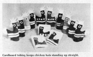 Available in a variety of bright colors to fit the tastes of skiers, concert goers, students or sports fans. One size fits all. Individual hats come complete with cardboard tubing to keep the chicken standing up straight.