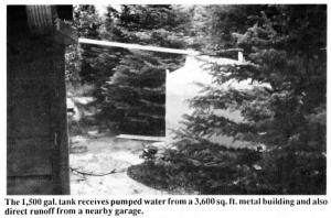 "My calculations indicate that .67 in. of rain from the 3,600 sq. ft. building alone will fill the 1,500 gal. tank if the rain is gentle enough so the sump pump can handle it. We use the stored water for garden and tree watering by gravity flow and even do some lawn sprinkling using a booster pump. The water could easily be used for livestock or to supply soft water to the house for laundering and other chores.