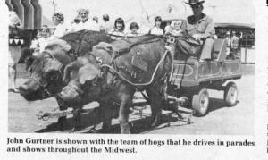 At one time, the Gurtners trained a pair of mini-pigs to drive as a team. "This breed, which weighs only about 75 lbs. when full grown, has a small amount of European wild hog blood in them. They're very intelligent. At maturity, they have a large and hard ridge or muscle on each side extending over the front part of the shoulder," explains John. "We paraded with them for about two years before they got balky and we quit driving them."