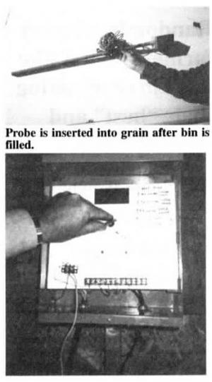 Individual probes are inserted into the top of the grain after bin is filled. The probes are wired to a central monitor that operates on 110V electricity, which it transforms to 24 volts DC., which may be wired by any-one. Checking grain temperature in up to 11 bins is as simple as flipping the dial and noting actual temperature of stored grain in each bin on the monitor's digital readout.