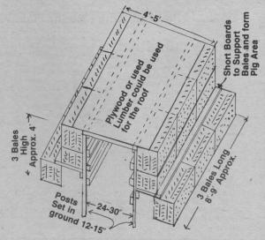 "The frame of the farrowing crate is made using scrap lumber. The crate is made to be three bales long and three bales high, making it 8 to 9 ft. long, 4 to 5 ft. high and 4 to 5 ft. wide. The house is designed with a pig area the width of one bale on the bottom. The roof boards, and end of the house, can be covered with bales of straw, when needed, to trap heat inside.