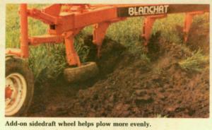 New from Blanchat Mfg., Harper, Kan., is an add-on sidedraft wheel for flex-type plows which eliminates most sidedraft and greatly reduces landslide wear. It also makes flex-type plows easier to pull and to plow more uniformly, says Greg Blanchat, inventor-manufacturer, who notes that the sidedraft wheel can also be adapted to other types of plows.