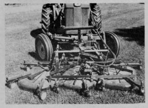 "My rig consists of three surplus Toro decks, purchased for $35 each, fastened together in such a way as to follow almost any ground contour. Power is supplied by the hydraulic pump on the tractor running a Gresen high speed hydraulic motor mounted on the center deck. The decks are joined so that the blades overlap in their cut."