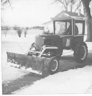 The 6 1/2-ft. blade is made out of 3/16-in. steel and fitted with a grader edge on bottom. I built loader arms out of 2 1/2-in. dia. pipe. The trick was arching the arms properly to clear the tractor's wide front axle. A 1 1/8-in. hydraulic cylinder raises and lowers a chain that supports the blade and is connected to the arms in the center of the tractor, which is equipped with a 5,000-lb. pump. The cab is 40 in. wide by 42 in. long by 50 in. high. The skin is sheet metal, bottom front panels are Plexiglas, side windows, which open and close, tempered glass and back window is tinted glass. It provides excellent visibility forward, backward and side-ways. It stays warm in winter, heated by the transmission. It detaches easily for summer operation by removing just four bolts from the tractor's fenders. I lift it on and off the tractor with a skid steer loader and chain attached to a bracket I mounted on top. (Ron Lansink, 306 5th St., Danbury, Iowa 51019; ph 712 883-2437 or 2394).