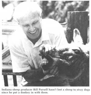 Indiana sheep producer Bill Pursell, of Spencer, was regularly losing sheep to stray dogs when, in 1976, he decided to try the idea of putting a donkey in with his sheep flock. He says he hasn't lost another sheep since to stray dogs.