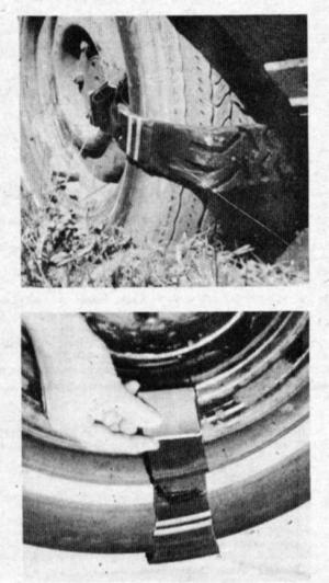Dyna-Bites strap onto the drive wheels. Each unit consists of a tire segment 3 in. wide and almost 1 in. thick with a nylon-webbed belt and buckle fastened to it. To "unstuck" a vehicle, you simply strap a Dyna-Bite to each drive wheel. The device is used in pairs - one for each driving wheel. Thus, a two-wheel drive vehicle requires one pair. Four-wheel drives take two pairs for maximum mobility.