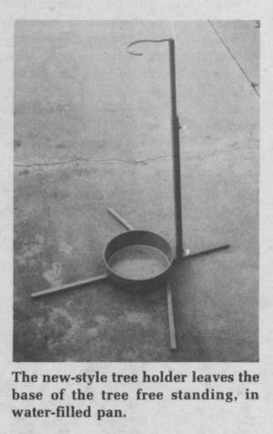 The holder's base is a 10 in. dia. pan which keeps the tree watered. An adjustable vertical pipe, with a hook at the top, holds the tree upright. The holder can be adjusted so the hook supports the tree, regardless of height, at mid-section. The base of the tree is free-standing inside the pan, requiring no bracing, adjustable screws and so forth to keep it standing straight.