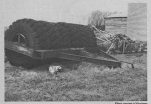 Old tires make a great cultipacker to pack and firm the soil to reduce erosion, according to Stan Goodman, Piney, Man., who built a 7-ton field cultipacker using large industrial earthmover tires. It cost him $1,200 to build the 16 ft. wide cultipacker, about 1/10th the cost of a comparably-sized commercial steel model, Goodman points out.