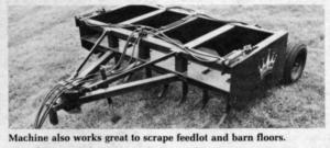 Eight "rippers" on the front of the 10 ft. wide Level-King can be raised or lowered, independent of the leveling box, right from the tractor seat. "At the touch of a hydraulic lever, the operator can rip rock-hard soil up to 8 inches deep. After ripping, he hits a lever to raise the ripper up and out of the way. He then goes back over the chiseled area with the blade to cut and move the loosened soil," explains Schaefer. "In addition to moving soil, it works great for scraping and cleaning feedlots and feeding floors."