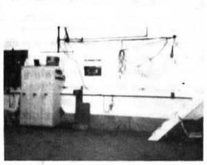 Handy Swing out Light FARM SHOP Tools 14-3-31 I made this handy swing-out light for my farm shop. It reaches out 20 ft. when fully ex-tended and has 3 functions. First it's equipped with a 25-ft. trouble light reel. Secondly, it has a 50-ft. extension cord which lets me go anywhere in my 40 by 50-ft. shop, even upstairs. The best feature is that it has a 1/2-in. air line running out to the end of the arm to which I attach 50-ft. of 1/2-in. coiled hose. The arm saves me the hassle of tripping over cords and air hoses. I built it using odds and ends of square tubing and old INC disc bearings. (Guy Mabon, Box 355, Notre Dame, Manitoba, Canada ROG 1MO ph 204 248-2085)