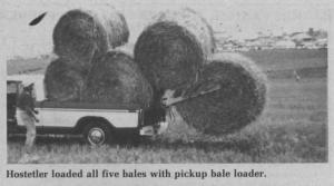 To load up, Hostetler first put two bales in the box and then grabbed a third bale towards its bottom in order to reach far enough to put it on top. Then he picked up the fourth, which he held until he backed up against a fifth bale. He Iet the fourth bale go against the fifth as it lay on the ground and then picked them both up at once.