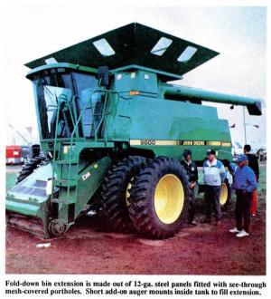 "As far as I know it's the largest bin extension on the market," says Vortherms. "It eliminates the need to leave trucks on both ends of a half-mile long field or to run a grain cart alongside the combine. It brings total combine capacity up to 500 bu. on the Gleaner R-60 model and 425 bu. on the Deere 9500 model. The existing Gleaner tank holds 300 bu. and an 18-in. high bin extension adds 200 bu. while the Deere 9500 tank holds 190 bu. and a 24-in. high bin extension adds 235 bu. Farmers who've used it haven't had any problems at all. I don't know what effect it has on the combine warranty, but for the last five years I've been selling bin extensions direct to some Deere dealers who install them on brand new combines. It can be mounted on the Deere 9600, 9500, 8820, and 7720 combines, but not the 6620 combine because the frame and rear axles aren't heavy enough. It can also be mounted on the Case-IH 1680 and 1660 models as well as Gleaner R-40, R-50, and R-60 models and N-5, N6, and N-7 models. The extensions are painted to look like part of the original combine. "The bin extension is no wider than the combine itself. The weight of the extra grain is supported by the subframe instead of the original tank, and the stabilizer arms pro-vide extra support when the combine drops into a hole or bounces over end rows. One stabilizer arm is mounted on the right sideof the combine in front, and the other is mounted on the left side at the rear."