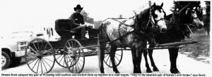 When he got a look at the herd of avail-able horses, Stork selected two good-looking stallions he named Bill and Buddy. At the time of the adoption, the horses were two and three years of age and weighed 900 and 1,000 lbs. He paid $125 for each, which merely paid for veterinary expenses.