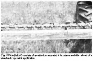 The "Wick-Sickle" consists of a cutter-bar mounted 4 in. above and 4 in. ahead of a standard rope wick applicator. The weed-killing combo mounts on a front end loader so it can be raised and lowered to run just above the top of the crop to cut off tall-growing weeds and volunteer corn.
