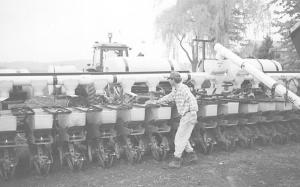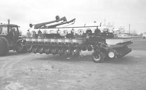 The seed fill system consists of two 22-ft. long, 6-in. dia. cross augers equipped with bristle flighting and 1-bu. directional hoppers mounted back-to-back at the center of the planter. Auger tubes and seed drop units, which feature shut-off slides, are constructed of PVC and polyethylene.