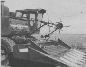 "It's designed so that wherever you position it, fore and aft, it always remains the same distance from the gathering chains. It's equipped with hydraulic lift arms so the operator can lift it up out of the way in fields with both down and standing corn. If you don't raise the reel in standing corn, the batts will knock the ears off before the corn gets into the head.