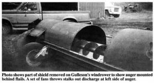 He bought an old Lundell 15-ft. wide flail chopper and removed the original hood over the flails and discarded it. He mounted a 12-in dia. auger behind flails to carry stalks to the left side of the chopper. Then Gulleson replaced the last 2 ft. of flighting on the auger with two fan blades 6-in. wide by 2-ft. long. The blades blow stalks out the back of the machine to form the wind-row.