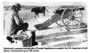 Mathwig's cannons are patterned after 18th and 19th century artillery models and include a 3/5 scale Napoleon era cannon, a 1/2 scale 1849 Civil War cannon, and a miniature 1/6 scale cannon. The Napoleon era cannon has a 5-ft. long barrel that'll shoot a 2-lb. cannonball up to 700 yards. The miniature 1/6 scale cannon has a 1-ft. long barrel that'll shoot small cannon balls right through a 50-gal. steel barrel from 45 yards away.