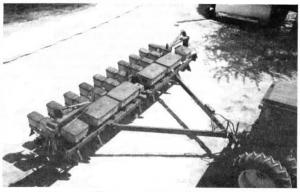Clement modified the planter for 30-in. rows by moving the eight row units closer together and adding two row units, one on each outside wing of the planter. To make room for all of the row units he had to reposition some of the carrying wheels as well as one of the planter's two transmissions, which he unbolted and slid over about 10 in. Each outside wing of the planter had originally consisted of two row units driven off the transmission by a 38-in. long hexagon drive shaft. To drive the additional row unit on each wing, Clement replaced the 38-in. long drive shaft with a 50-in. long shaft which operates all three row units.