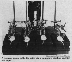 According to a report in the New Zealand Farmer, scientists at West Germany's University of Ulm need mouse milk for research on a regular basis. Since there is no reliable supply available, they had to find their own source. Their research involves making comparisons of mouse milk with human breast milk.