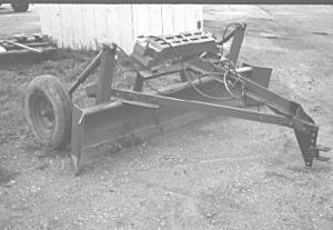 It consists of a "wishbone" hitch, made from heavy angle iron, that extends back over the blade to a pair of rubber-tired wheels. Each wheel is fitted with a hydraulic cylinder for precise depth control. Cutting angle of the blade can be made more or less aggressive by moving the hitch on the tongue up or down. The blade simply tows off the tractor drawbar.