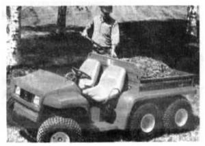 The larger 18 hp GATOR "6 by 4" rides on a 6-wheel chassis with 4-wheel drive and differential lock. It's powered by a twin cylinder liquid cooled KHI engine. Total payload capacity (with operator and passenger) is 1,200 lbs. Maximum ground pressure for a fully-loaded 6 by 4 vehicle is only 7.1 psi, allowing you to travel through mud, muck or snow more easily. Retails for right at $6,600.